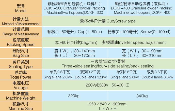 您的位置:首頁(yè) > 產(chǎn)品展示 > 顆粒自動(dòng)包裝機(jī) > DCKF-300-1/DCKF-300-2三邊封/四邊封顆粒粉末兩用背封包裝機(jī)技術(shù)參數(shù):